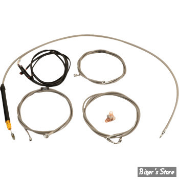 Kit tressé inox comprenant câble d'accélérateur, câble de ralenti (sauf indication contraire), câble d'embrayage, durites de frein, raccord en T chromé, vis banjo, raccords et rondelles d'étanchéité en cuivre