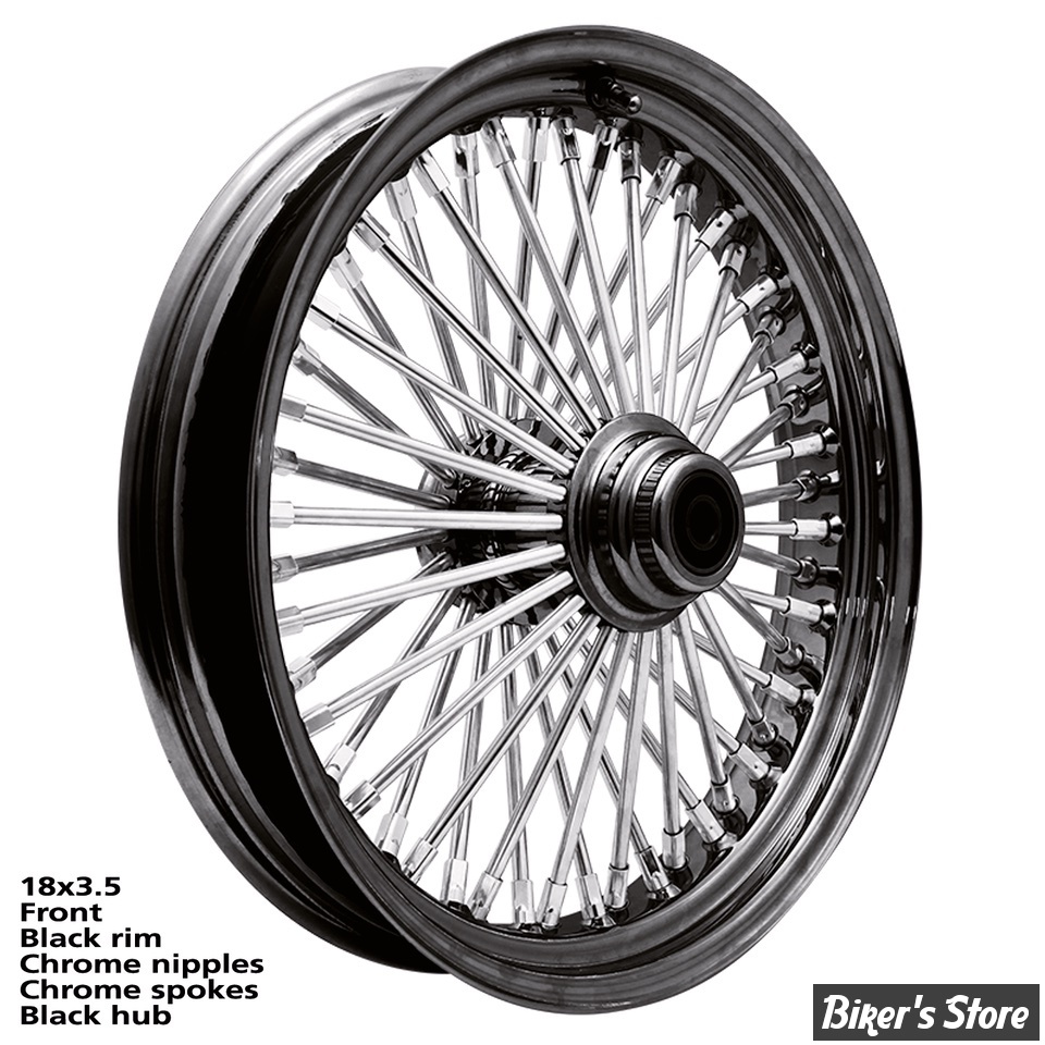 Ces roues avec 50 gros rayons, aussi connues sous le nom de "Fat Daddy" sont fabriquées aux USA et utilisent un rayonnage radial avec des rayons droits de 3/8" (9.5mm) de diamètre en inox qui sont polis ou noirs avec des têtes de rayon custom, moyeux usinés en aluminium et jantes chromées.