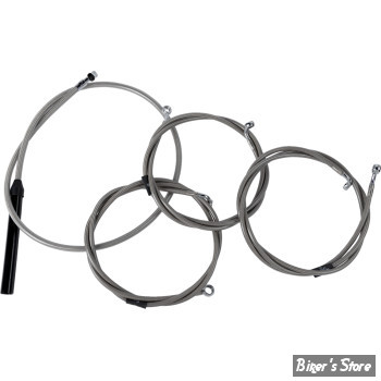 Kit tressé inox comprenant câble d'accélérateur, câble de ralenti (sauf indication contraire), câble d'embrayage, durites de frein, raccord en T chromé, vis banjo, raccords et rondelles d'étanchéité en cuivre