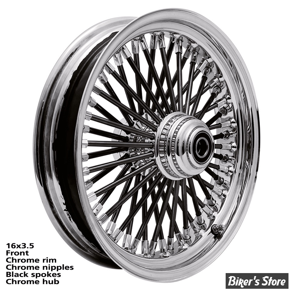 Moyeu chromé, jante chromés et rayons noirs, écrous chrome