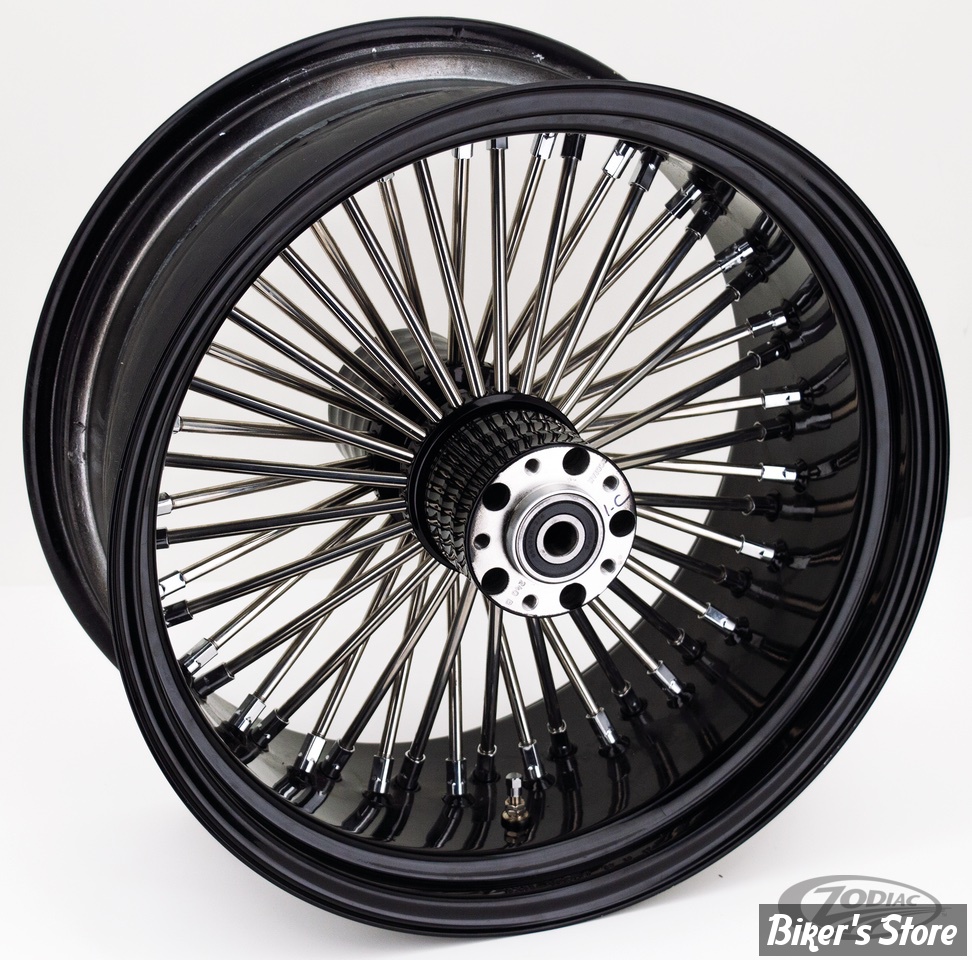 Ces roues avec 50 gros rayons, aussi connues sous le nom de "Fat Daddy" sont fabriquées aux USA et utilisent un rayonnage radial avec des rayons droits de 3/8" (9.5mm) de diamètre en inox qui sont polis ou noirs avec des têtes de rayon custom, moyeux usinés en aluminium et jantes chromées.
