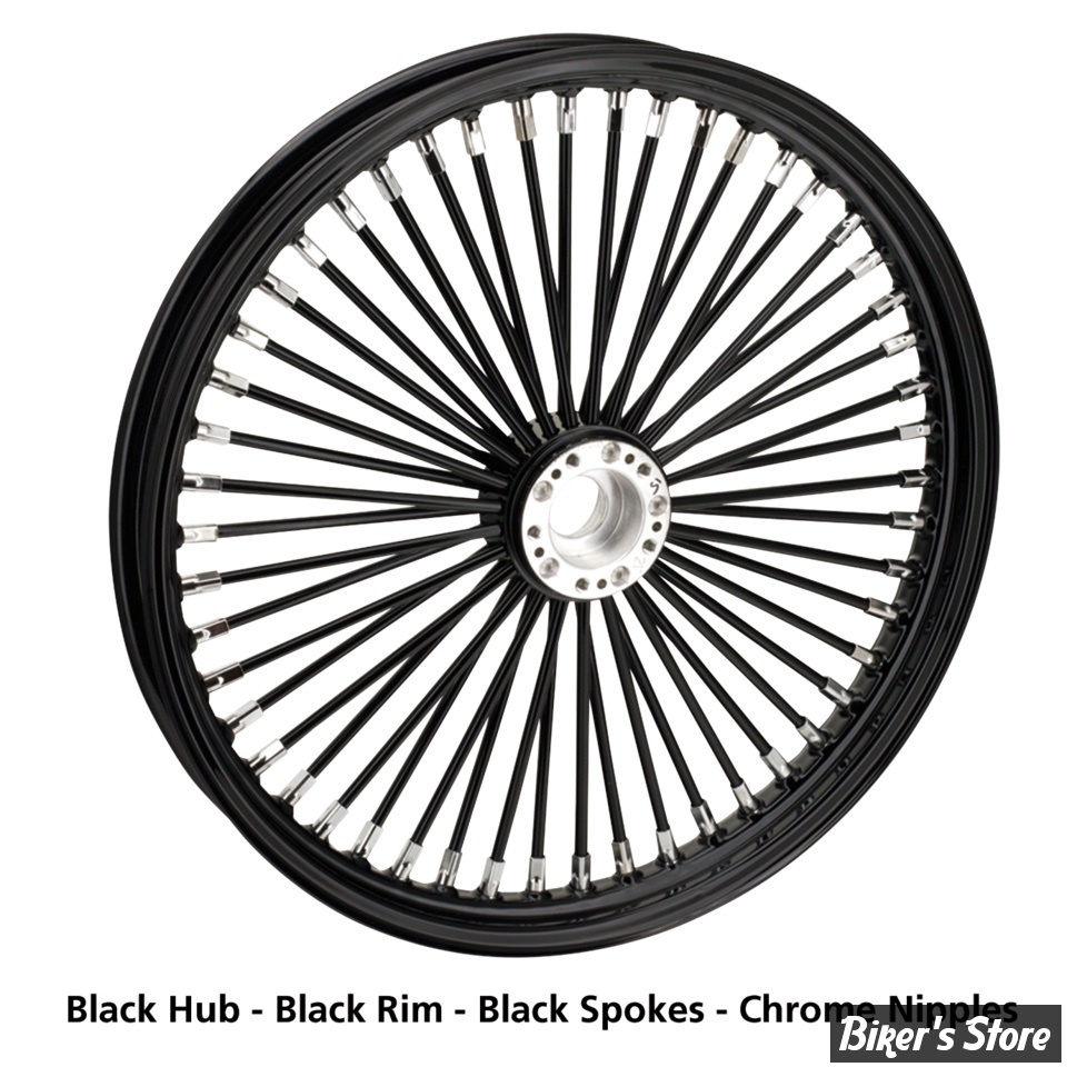 Ces roues avec 50 gros rayons, aussi connues sous le nom de "Fat Daddy" sont fabriquées aux USA et utilisent un rayonnage radial avec des rayons droits de 3/8" (9.5mm) de diamètre en inox qui sont polis ou noirs avec des têtes de rayon custom, moyeux usinés en aluminium et jantes chromées.