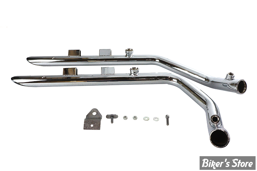 -Les tuyaux de traînée avec port de capteur d'oxygène et extrémités de coupe oblique noires présentent une finition chromée. Ces tuyaux ont un diamètre de 1 à 3/4" et une longueur de 34".