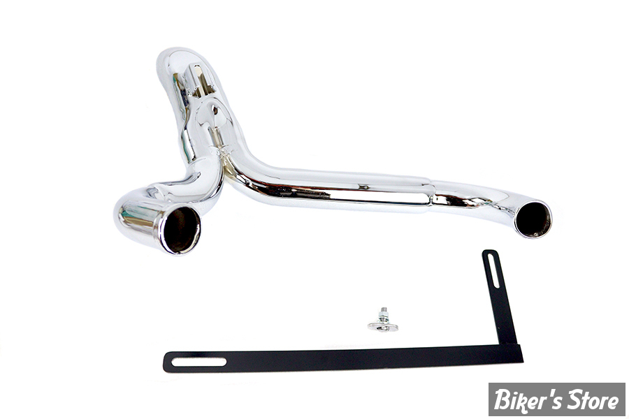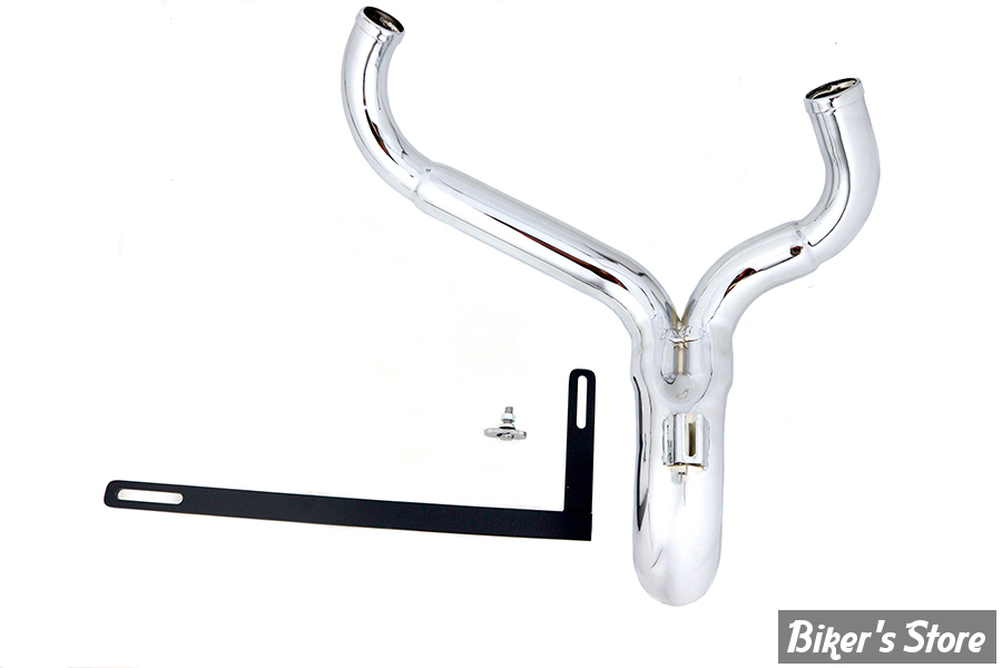 Chrome lake "y" style dumper exhaust header pipe is designed to look like hot rod side exhausts. The turn out end is 3" diameter. Fits with forward controls only.