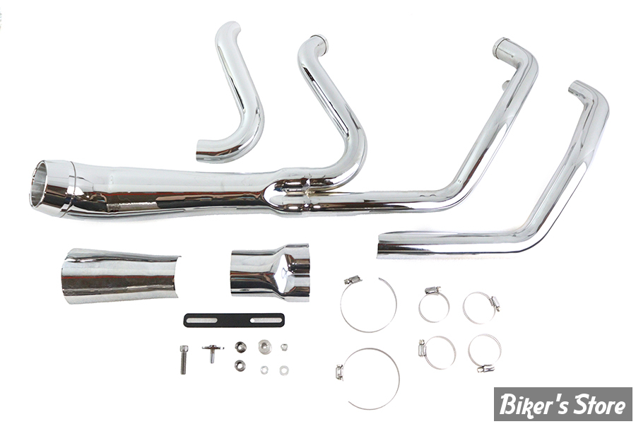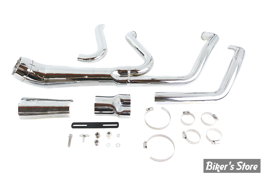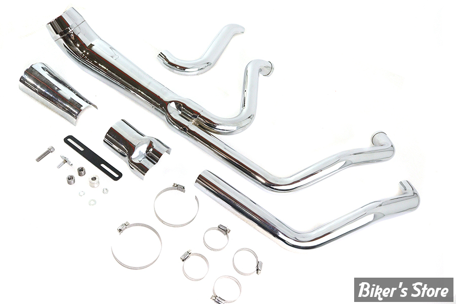 L'ensemble d'en-têtes d'échappement Chrome cyclone 1-3/4" 2 en 1 comprend des boucliers thermiques à couverture complète avec un énorme silencieux baffle de 4" de diamètre.