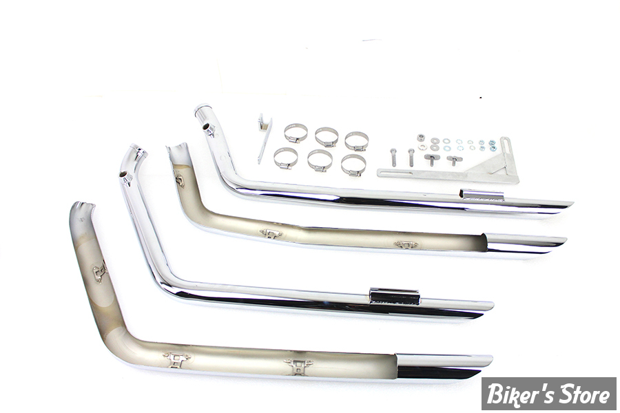 Drag Pipes 1-3/4" avec un ensemble de boucliers thermiques de 2" à couverture complète, tous deux dotés d'une finition chromée.