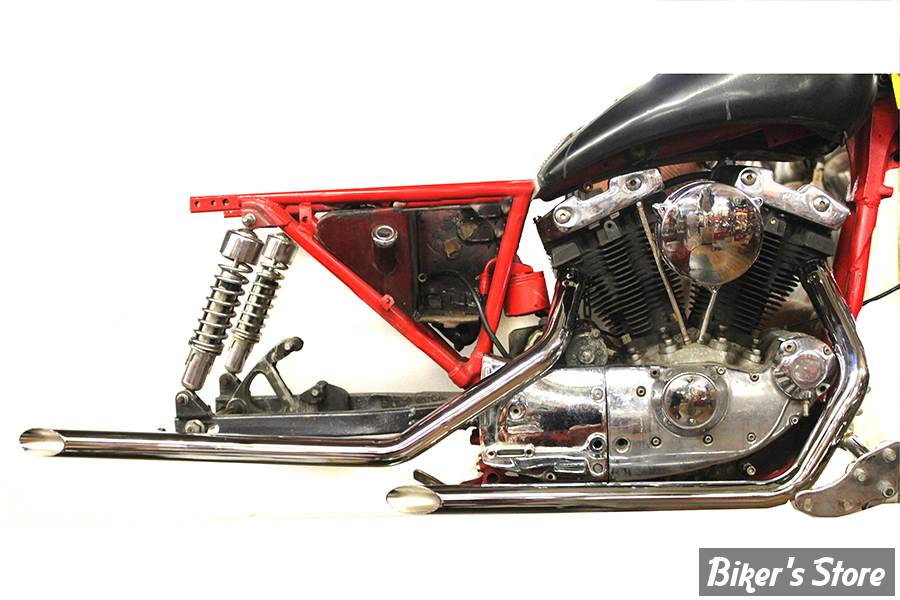 Drag Pipes dotés d'un tuyau avant de 28" de long et d'un tuyau arrière de 38" de long, qui se monteront avec des supports d'origine.