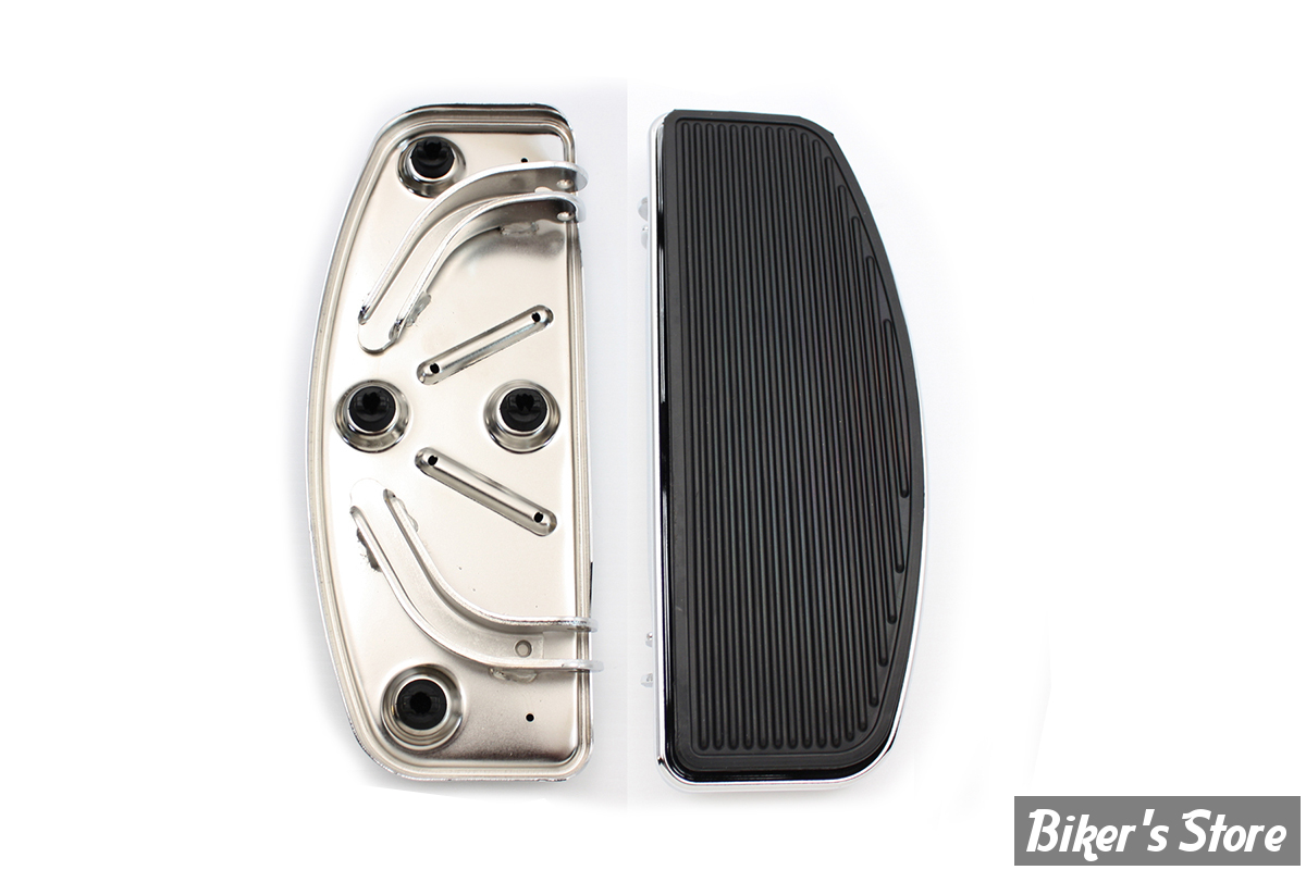 Made of stamped steel, these D-shaped chrome footboards feature an ISO design with rubber inserts.