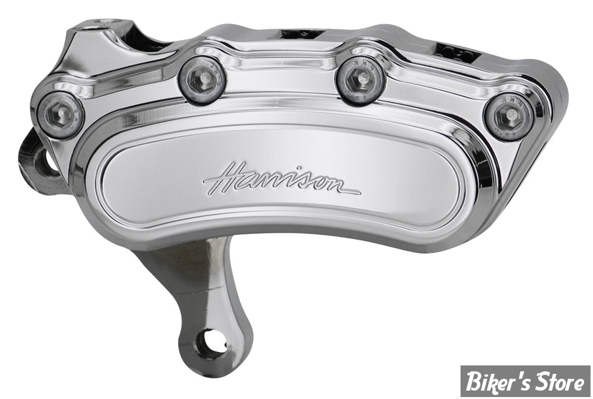 For those looking for a more slender line for their caliper we also have their 4 and 6 piston calipers in the Harrison ''Slimline'' range. Like the original Harrison ''Billet'' calipers, each caliper is precisely CNC machined from quality aluminum and with special low-expansion hard anodized pistons and a set of brake pads for each piston. Harrison says that this gives more bite on the disc than two plquettes or asymmetrical stirrups. It is also particularly beneficial in wet conditions, because the first set of pads sweeps the water out of the disc while the next 2 or 4 pads will bite the disc. This removes the skidding effect of the calipers on the disc. The Harrison Slimline Calipers are truly progressive, with a direct and sensitive relationship between the amount of lever pressure and the amount of braking power. These exist in polished, chrome or black anodized in 4- and 6 pistons. The front calipers are mounted on the front fork sheaths and for the rear the mounting bracket is provided. Stainless steel wedges to space the caliper on the disc as well as mounting bolts are included with each kit. The matching records can be found elsewhere in this catalog.