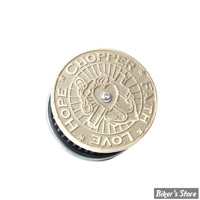 Aluminum. 'Chopper-Faith-Love-Hope'. Sand-cast and in-house produced air cleaner in an un-polished 'stone washed' works finish. Ready to transport your bike to the sub-zero coolness dimension. Small production series warrant exclusivity. A true handmade Piece of Art.
