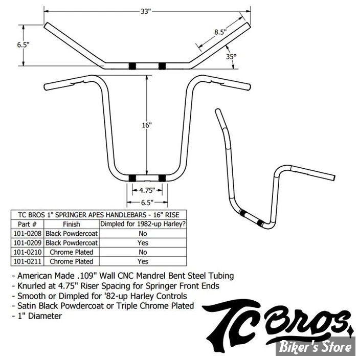 - Guidon TC. BROS - TC BROS. 1" SPRINGER APES HANDLEBARS - APES 16" - SANS EMPREINTES - CHROME - 101-0210