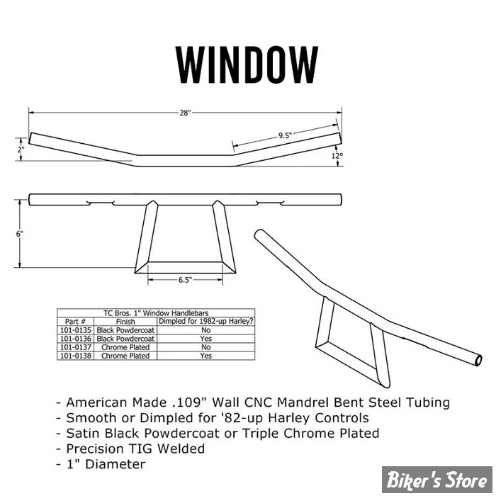 Le guidon Window, également appelée barre Attack, est un élément de base des motos Harley-Davidson modifiées. Les TC Bros. ont mis leur tournure inimitable sur ce vieux classique avec cette barre de fenêtre qui est un peu différente des autres sur le marché.