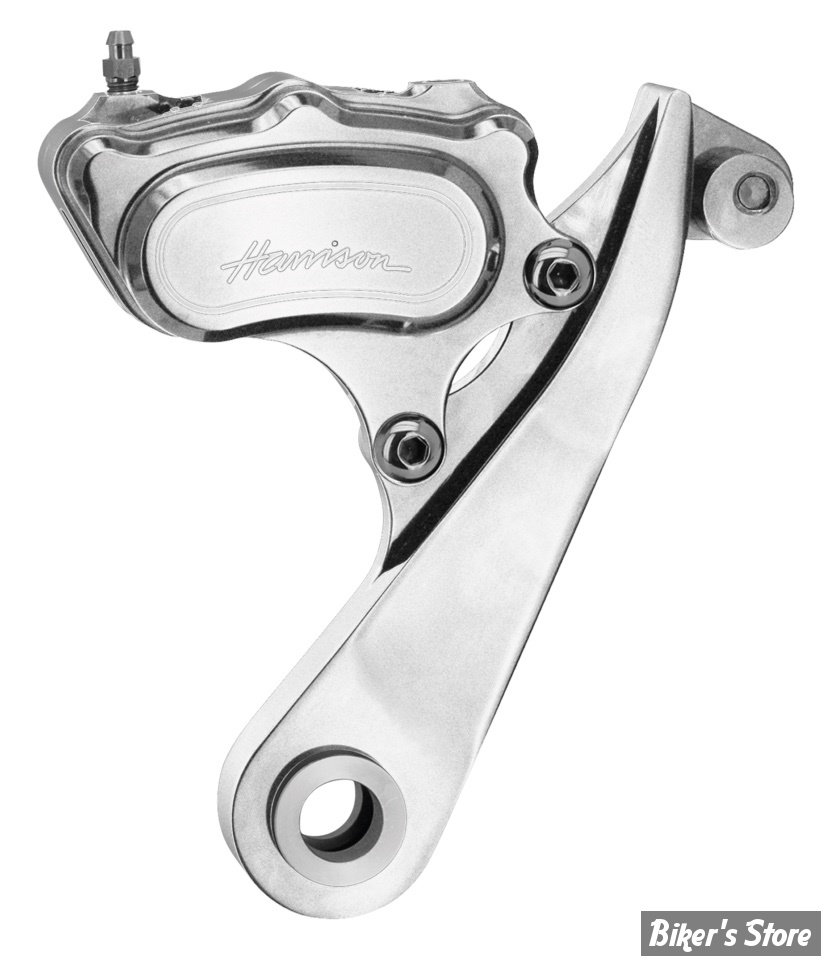 For those looking for a more slender line for their caliper we also have their 4 and 6 piston calipers in the Harrison ''Slimline'' range. Like the original Harrison ''Billet'' calipers, each caliper is precisely CNC machined from quality aluminum and with special low-expansion hard anodized pistons and a set of brake pads for each piston. Harrison says that this gives more bite on the disc than two plquettes or asymmetrical stirrups. It is also particularly beneficial in wet conditions, because the first set of pads sweeps the water out of the disc while the next 2 or 4 pads will bite the disc. This removes the skidding effect of the calipers on the disc. The Harrison Slimline Calipers are truly progressive, with a direct and sensitive relationship between the amount of lever pressure and the amount of braking power. These exist in polished, chrome or black anodized in 4- and 6 pistons. The front calipers are mounted on the front fork sheaths and for the rear the mounting bracket is provided. Stainless steel wedges to space the caliper on the disc as well as mounting bolts are included with each kit. The matching records can be found elsewhere in this catalog.