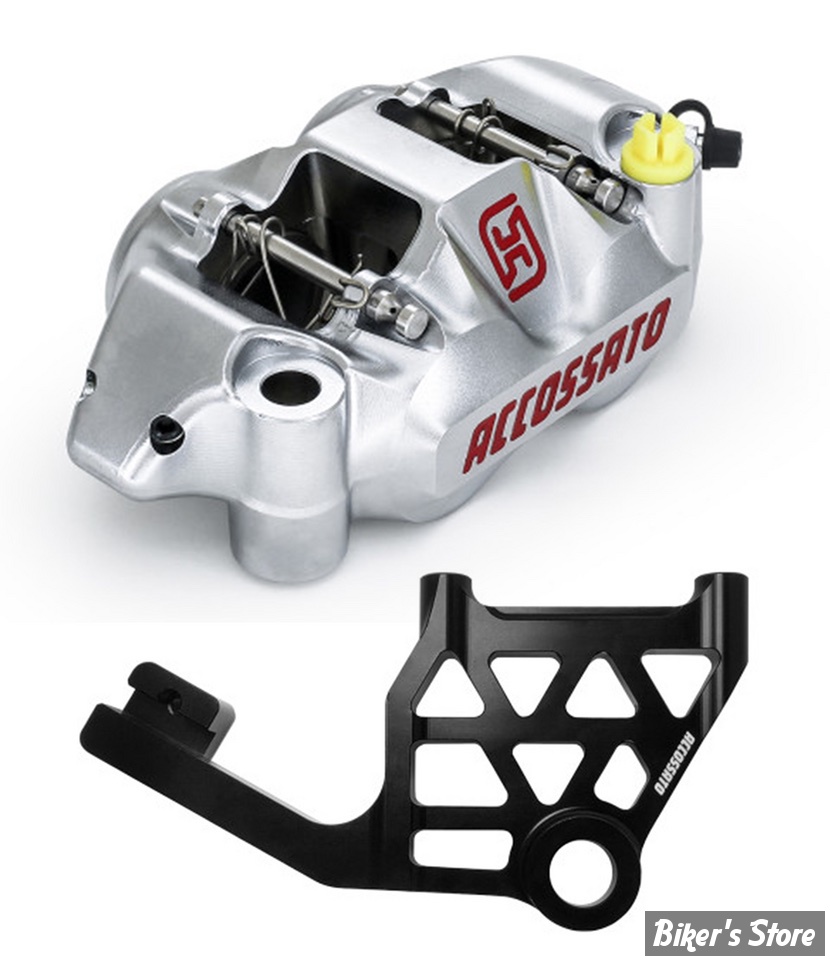 - Le nouvel étrier de frein radial, composé de deux pièces et fabriqué dans la masse, enrichit la gamme d'étriers Accossato. Conçu avec les technologies les plus avancées et les meilleurs matériaux du marché, il l'est tout particulièrement par sa structure usinée CNC 5 axes. Sa forme a été réalisée grâce à la recherche CAO afin d'obtenir un poids minimal, une rigidité optimale du corps et une capacité de déperdition thermique optimale grâce à un traitement spécial d'oxydation dure. Lors de l'usinage, le corps de l'étrier est entièrement contrôlé par des machines de laboratoire tridimensionnelles. L'entraxe des trous de fixation des étriers est de 108mm. Accossato recommande l'utilisation de liquide de frein DOT 4. Les étriers sont fournis avec des plaquettes de frein frittées.