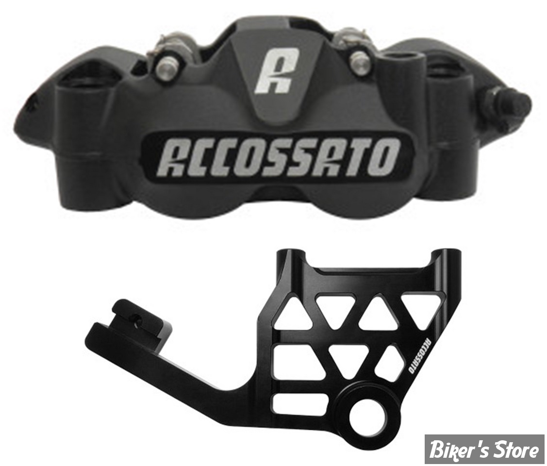 - Le nouvel étrier de frein radial, composé de deux pièces et fabriqué dans la masse, enrichit la gamme d'étriers Accossato. Conçu avec les technologies les plus avancées et les meilleurs matériaux du marché, il l'est tout particulièrement par sa structure usinée CNC 5 axes. Sa forme a été réalisée grâce à la recherche CAO afin d'obtenir un poids minimal, une rigidité optimale du corps et une capacité de déperdition thermique optimale grâce à un traitement spécial d'oxydation dure. Lors de l'usinage, le corps de l'étrier est entièrement contrôlé par des machines de laboratoire tridimensionnelles. L'entraxe des trous de fixation des étriers est de 108mm. Accossato recommande l'utilisation de liquide de frein DOT 4. Les étriers sont fournis avec des plaquettes de frein frittées.