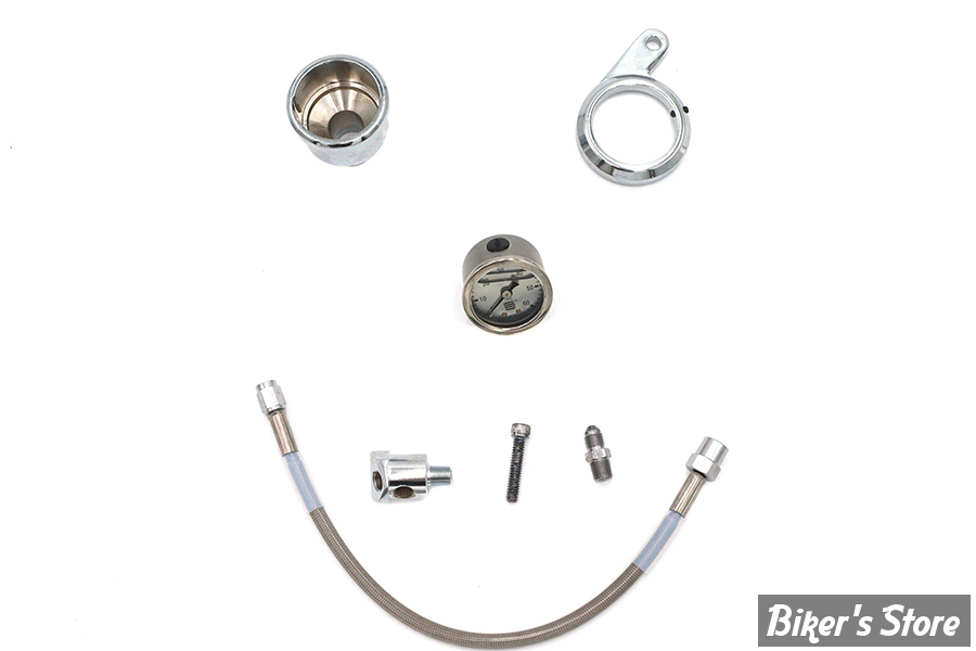Rocker box oil pressure kit features 0-60 lb liquid filled gauge, indicator lamp switch, chrome bracket & screw. Stainless steel line also included.