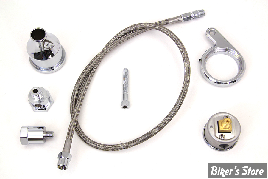 Rocker box oil pressure kit features 0-60lb liquid filled gauge, indicator lamp switch, chrome bracket and screw to mount to head and stainless steel line.