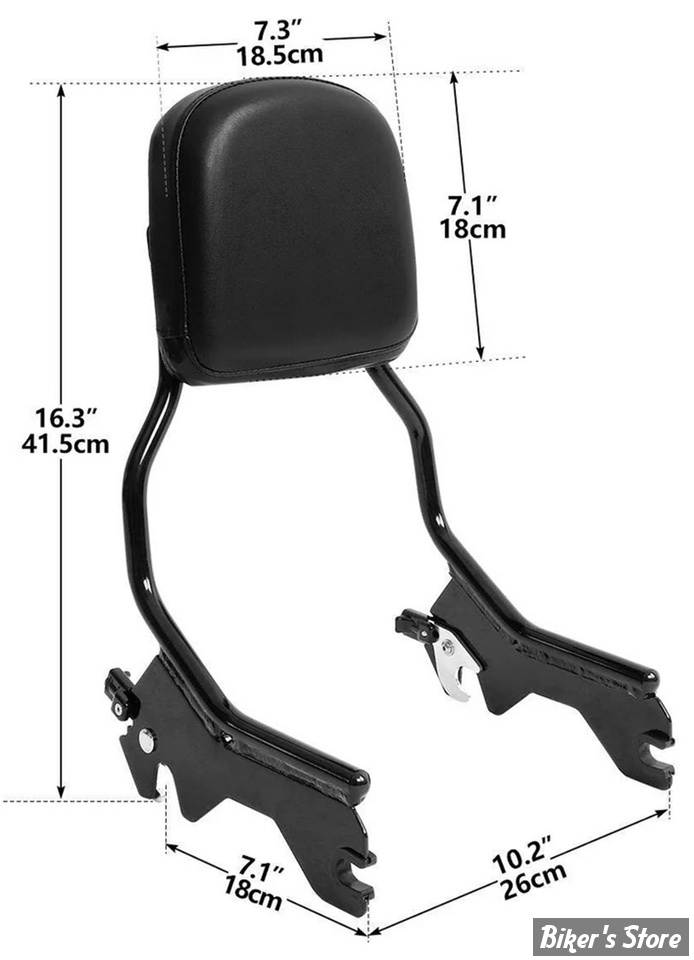 Un sissy bar monobloc qui élimine le besoin de plaques latérales. Le sissy bar à tube rond est livré avec le coussin arrière assorti dans un kit pratique. Installez ou retirez le tout en moins d'une minute. Le kit a une hauteur totale de 41cm, le coussin mesure 19cm de large et 16cm de haut.