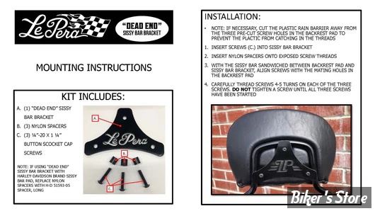 If using Dead End sissy bar brackets with a HD brand sissy bar pad, replace nylon spacers with HD OEM #51593-05 spacer, long.