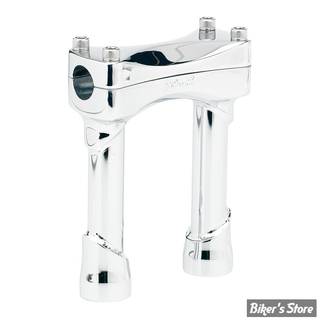 Chrome plated. This comes with approval. For 1" (25.4mm) handlebars. Constructed from investment cast steel upper & threaded lower. Riser tubes are TIG welded seamless 4130 chromoly with 3mm thick tubing and 1/2-13 threaded mounting holes which will take stock riser bolts. Spacing is 3-1/2" (89mm), to fit most H-D top triple trees. The top clamp bolt pattern will take stock H-D speedo & tach brackets. Note: Check your local MCS dealer or the MCS sales department for exact type of approval and validity on bike model and years on the test report.