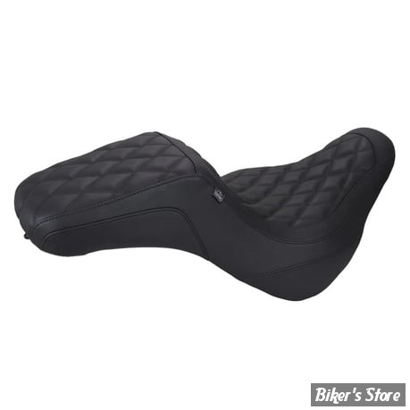 11.5" wide driver bucket is cut low and backed by a high-rising rear wall that provides crucial lower back support for confident riding. A squared-off 7" wide passenger section offers added functionality for two-up travel, without compromising the bike’s performance-inspired stance.
