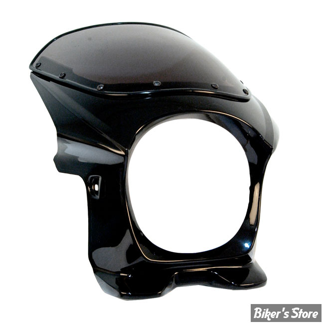 Carénage de phare noir brillant avec pare-brise teinté foncé. Conçu pour être monté sur un phare de 7" de diamètre. N'inclut pas le matériel de montage. Remarque : un pare-brise de remplacement est disponible sous la référence MCS580485.