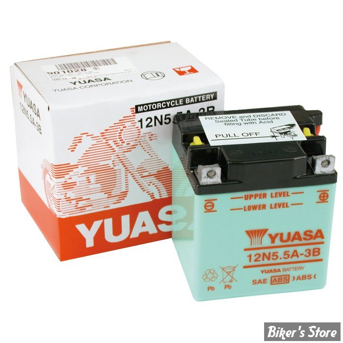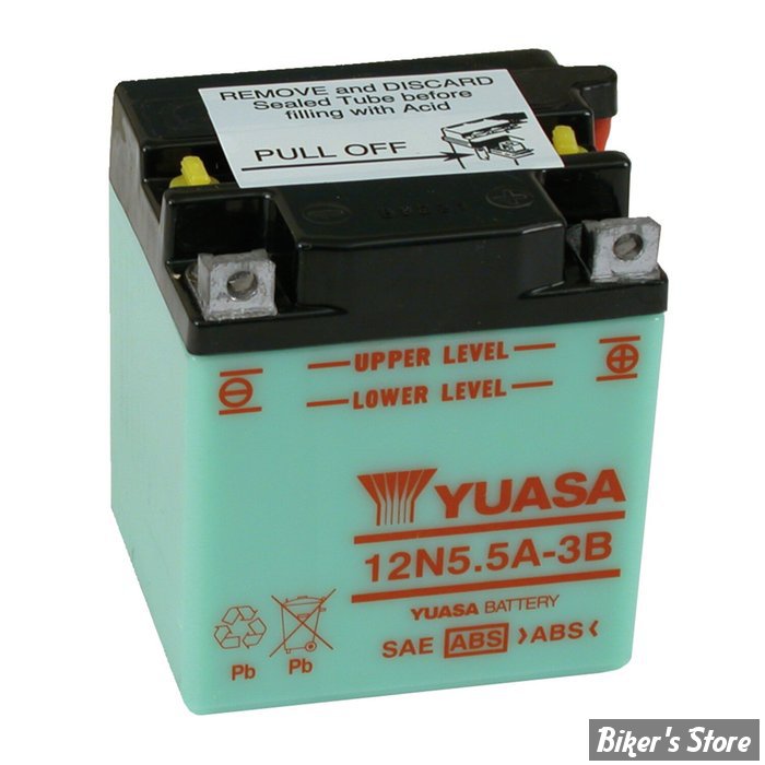 55CCA (Amplis à démarrage à froid). Batterie conventionnelle 12N5.5A-3B / 12N5.5A-3B-BS 12V. Dimensions : 104 mm de long x 91 mm de large x 115 mm de haut. Poids avec de l'acide 2,4 kg. Volume acide 0,5 litre. Charge avec 0,6A.