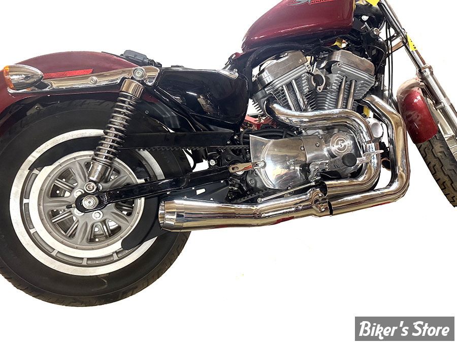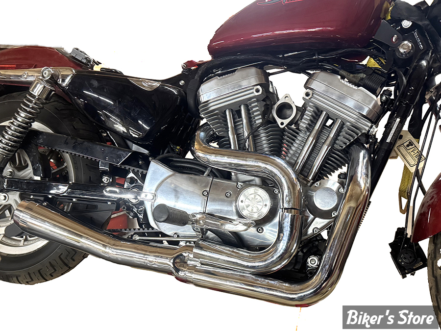 Le système d'en-tête d'échappement Sportster holeshot 2:1 est doté d'une finition chromée. Le système comprend des tuyaux d'en-tête de 2", un bouclier thermique de 2-1/4" monté. Le tuyau arrière s'écoule vers l'avant et s'enroule autour du couvercle de distribution.