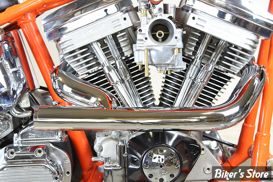 Jeu de tube d'échappement siamois 2:1 avec un diamètre extérieur de 1-3/4", s'adapte sous le carburateur sur des cadres rigides ou à bras oscillant avec moteur Evolution Big Twin ou Sportster.