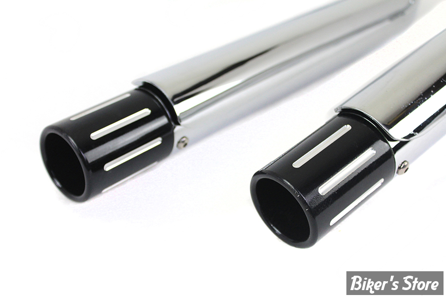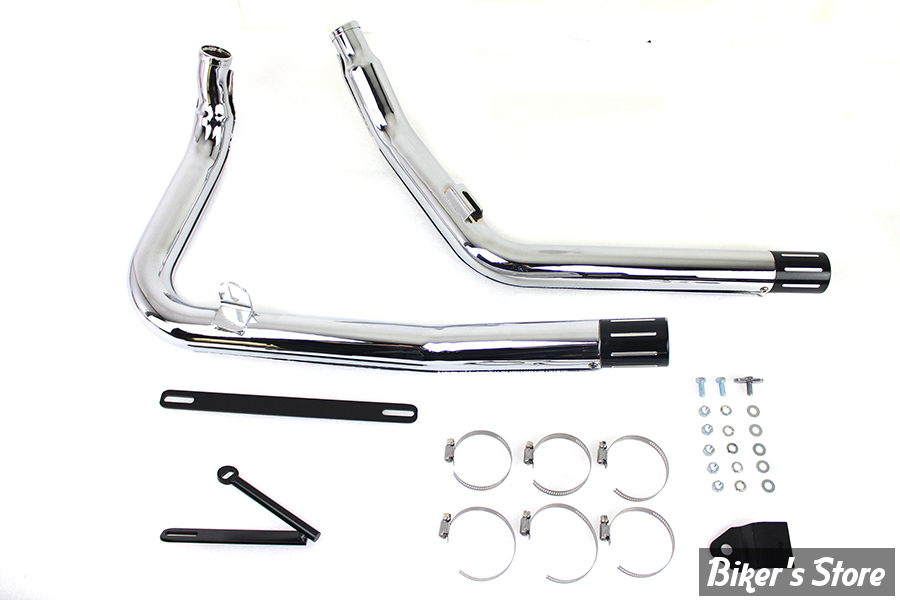 L'ensemble de tuyaux de traînée Vortex MCM 2-1/4" comprend des boucliers thermiques chromés à couverture complète de 2-3/8" de diamètre, des tuyaux d'en-tête de 2-1/4" et des extrémités de vortex fraisées à billes noires.