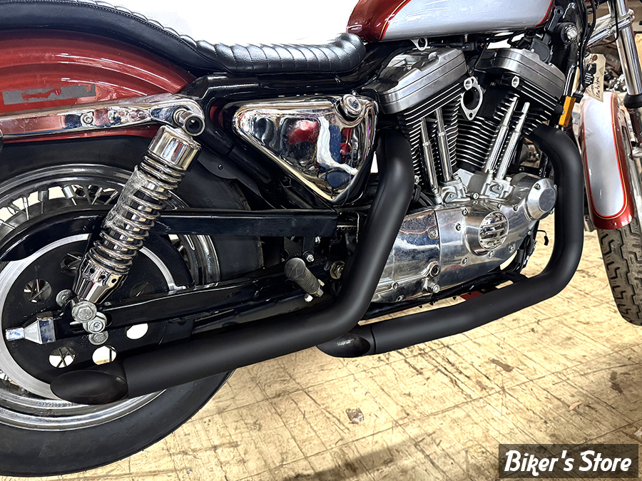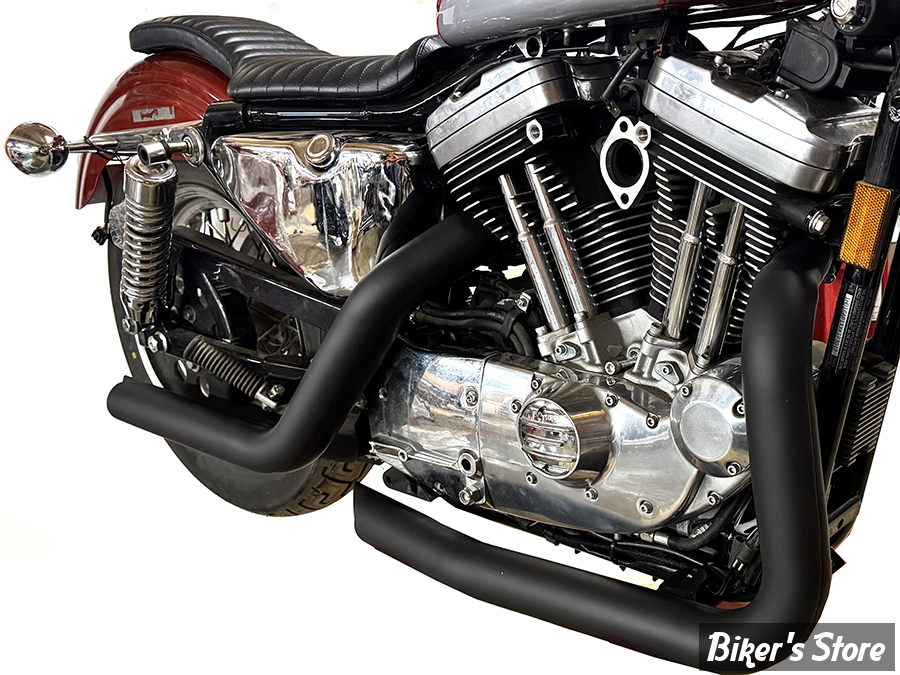 Echappement Wyatt Gatling 2-1/4" pour les modèles XL 1986-2003. Cet ensemble de tuyaux comprend des tuyaux d'en-tête de 2-1/4", des boucliers thermiques à couverture complète de 2-1/2", des extrémités coupées obliques et une finition noire. Les déflecteurs ne sont pas inclus.