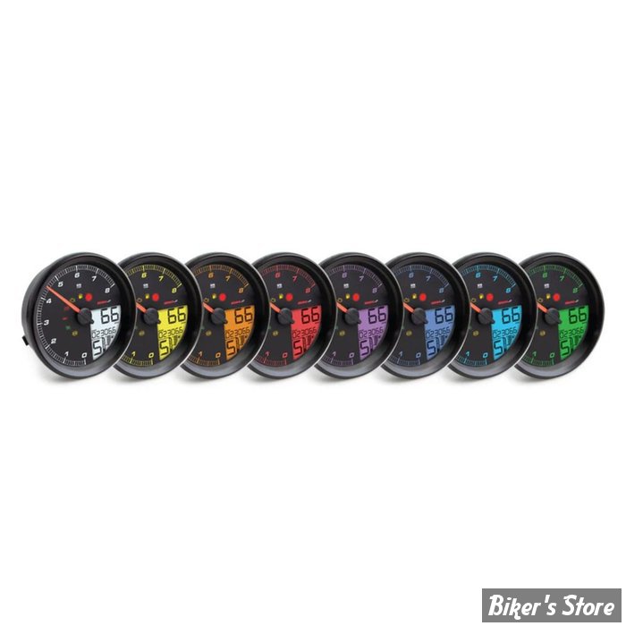 Black face, black bezel. Replacement for the later 4.5 (11.43cm) diameter tank mounted H-D speedometers. Connects plug & play to the existing wiring and is fully compatible with the bike's CAN-bus system. Offers speedometer (kmh/mph), tachometer, odometer, two trip meters, rev limit setting, shift light, multiple color backlights, gear indicator, engine temperature, battery voltage, fuel level indicator, average fuel consumption and more.