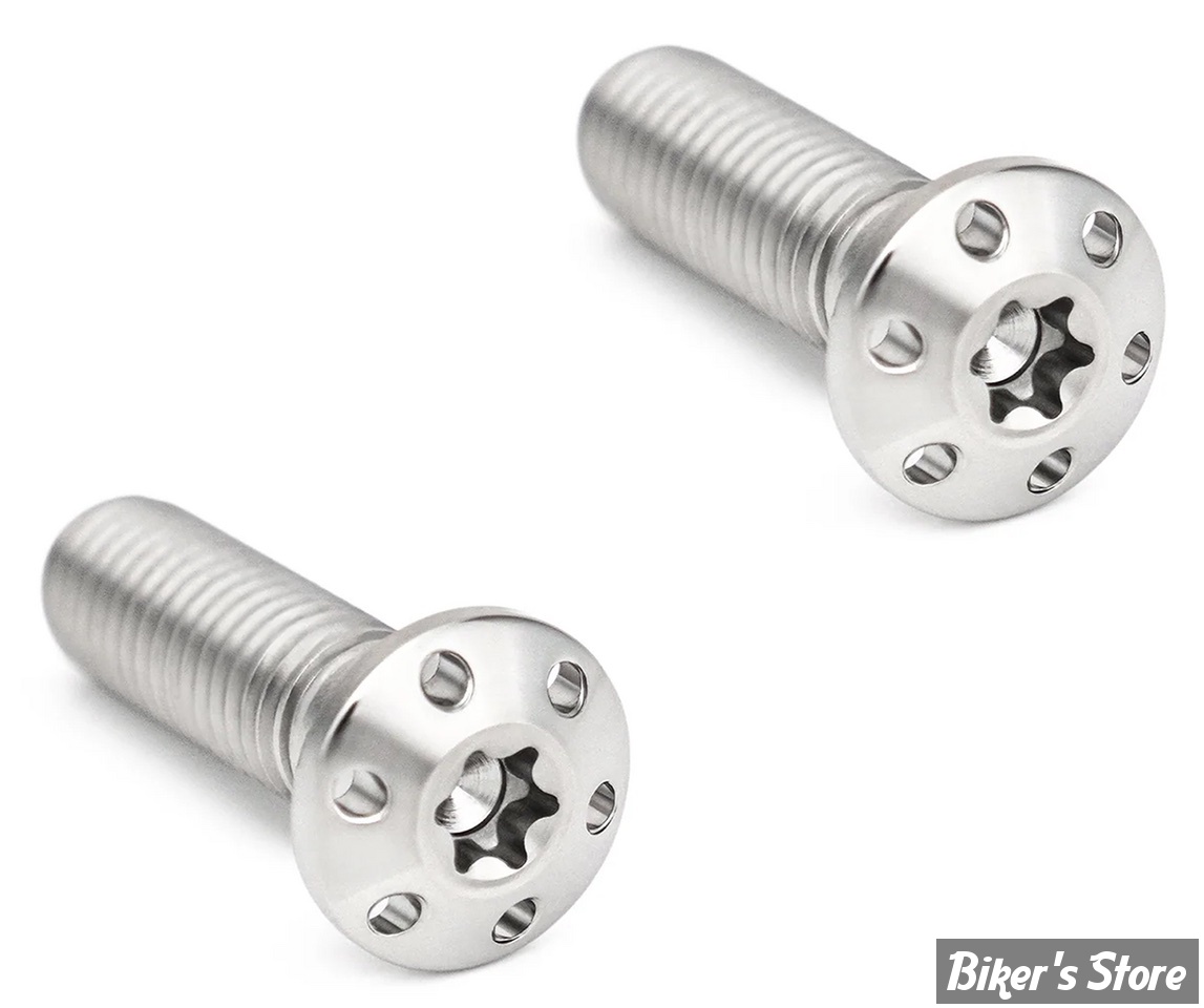 Vis d'étrier de frein usinées CNC en titane avec un trou qui permet de réduire le poids par rapport aux pièces d'origine et à la visserie en acier inoxydable. Chaque kit comprend deux boulons de fixation d'étrier de frein en titane (un kit est nécessaire par étrier de frein).