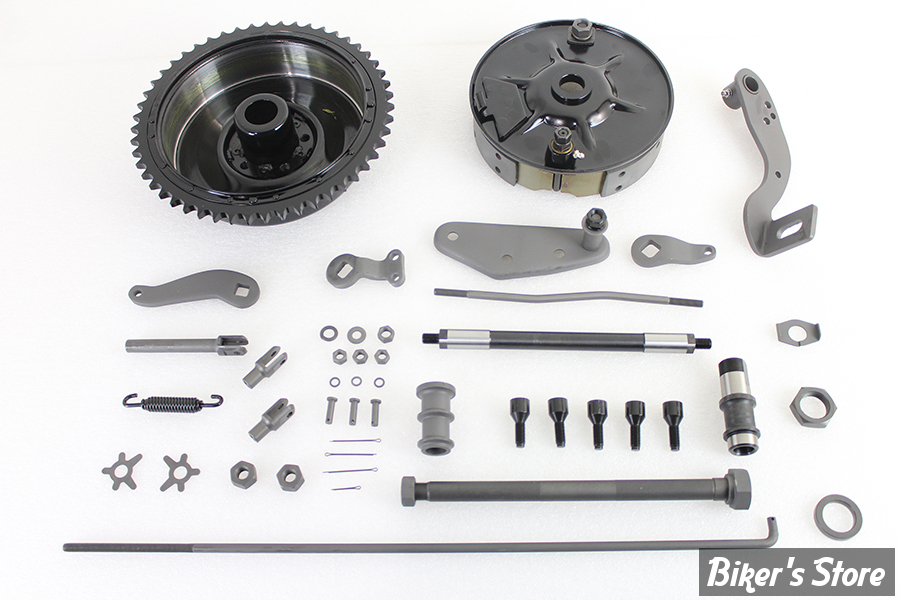 Ensemble de tambour arrière, kit d'essieu, pièces de kit de pédale et de liaison fournies en finitions noires et parkerisées pour les exigences de restauration. *REMARQUE : En 1936-1957 Big Twins, le bras du levier de frein arrière est orienté vers l'arrière et vers l'intérieur