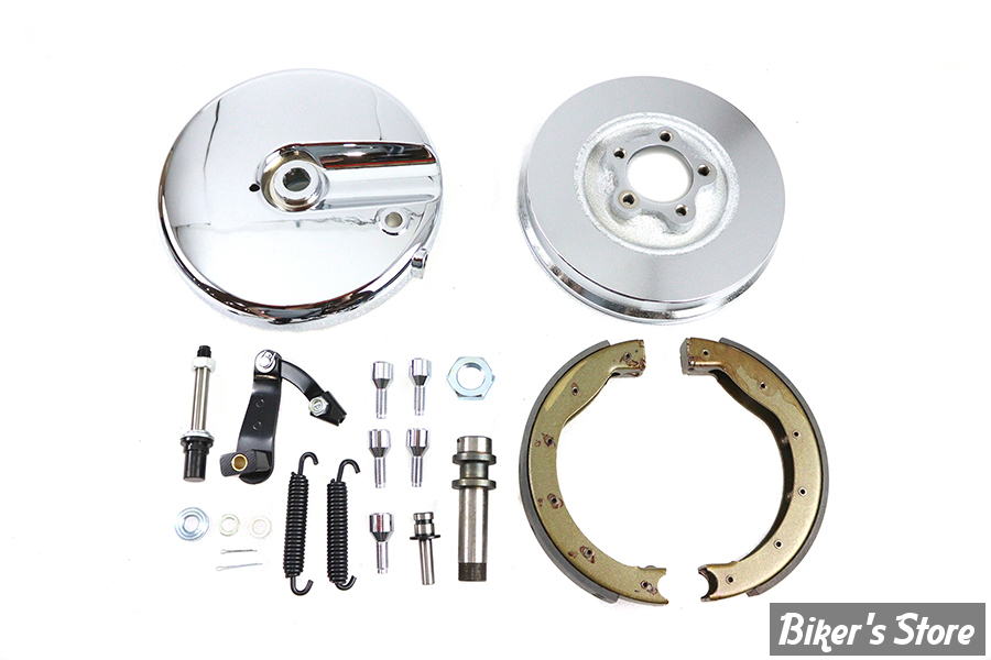 Kit includes brake shoes, springs, chrome backing plate, chrome drum, axle sleeve, nuts, cam with lever andmount stud for left side brake.