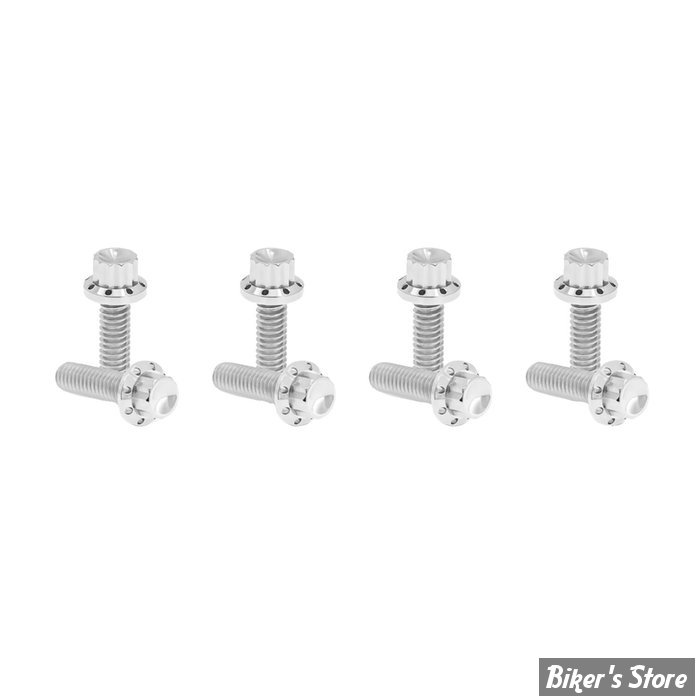 Ces kits de vis de cache-culbuteurs à 12 pans sont usinés CNC en titane. Chaque boulon en titane à 12 pans est usiné CNC et présente un trou d'allègement sur la bride. Ils sont plus légers que les pièces d'origine et sont en acier inoxydable (les kits pour moteur M8 incluent les boulons du cache-culbuteurs et du couvercle d'allumage. Les kits pour Twin Cam n'incluent pas les boulons du couvercle d'allumage). Disponibles en finition polie, noire et dorée.
