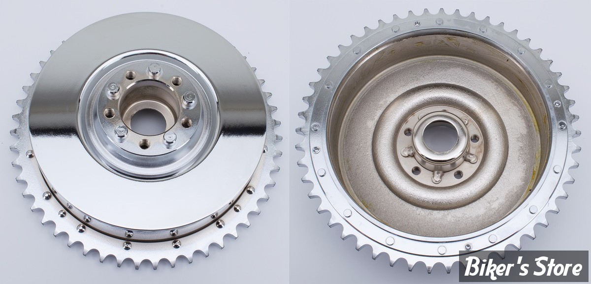 Les tambours arrières sont assemblés avec la couronne. Ils sont rectifiés et usinés après le chromage. Mieux ou excède les spécifications OEM. Pour chaîne de la série 530.