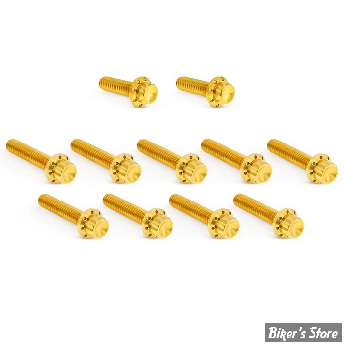 Ces kits de vis de cache-culbuteurs à 12 pans sont usinés CNC en titane. Chaque boulon en titane à 12 pans est usiné CNC et présente un trou d'allègement sur la bride. Ils sont plus légers que les pièces d'origine et sont en acier inoxydable (les kits pour moteur M8 incluent les boulons du cache-culbuteurs et du couvercle d'allumage. Les kits pour Twin Cam n'incluent pas les boulons du couvercle d'allumage). Disponibles en finition polie, noire et dorée.