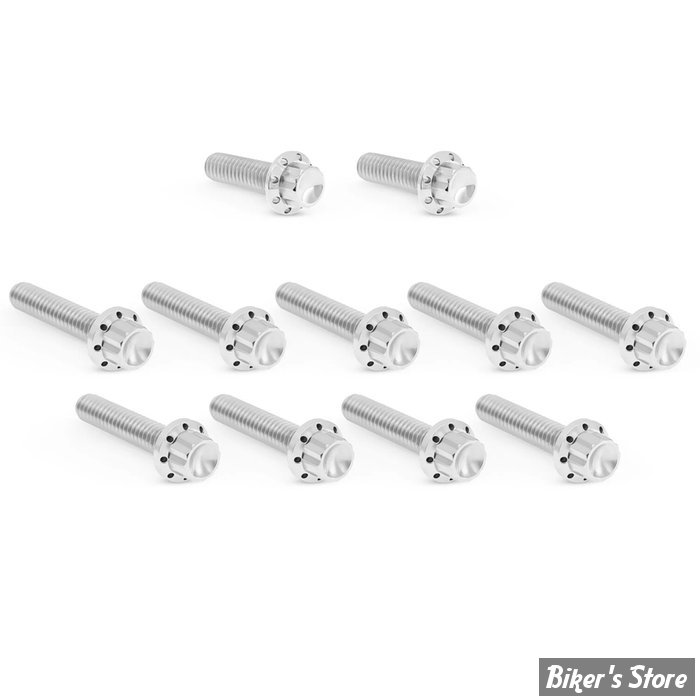 Cam cover and timer cover bolt kit with the bolt head spot drilled, with a lightning hole design on the bolt flange. Reduced weight compared to steel or stainless and sure to add a wow factor. Excellent corrosion resistant.
