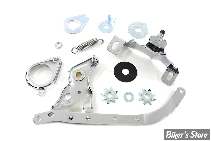 Chrome rocker clutch style foot clutch control assembly includes foot clutch pedal spring, rocker clutch cover, rocker clutch pedal, foot clutch lever bracket, and a jockey clutch friction kit.