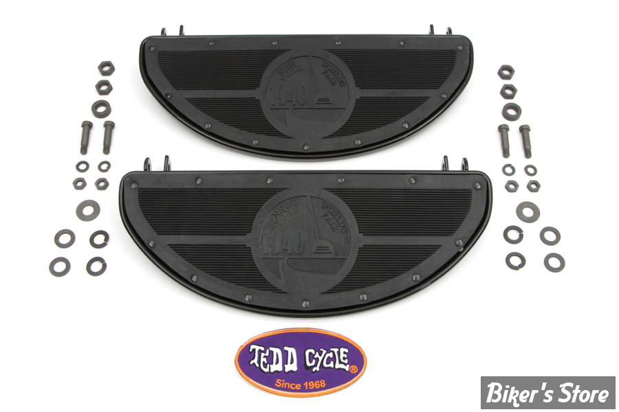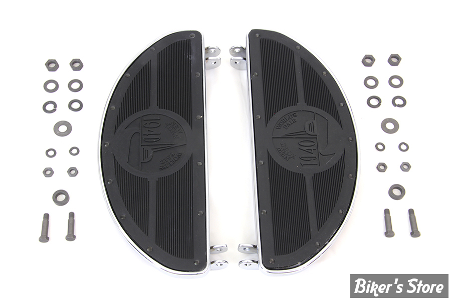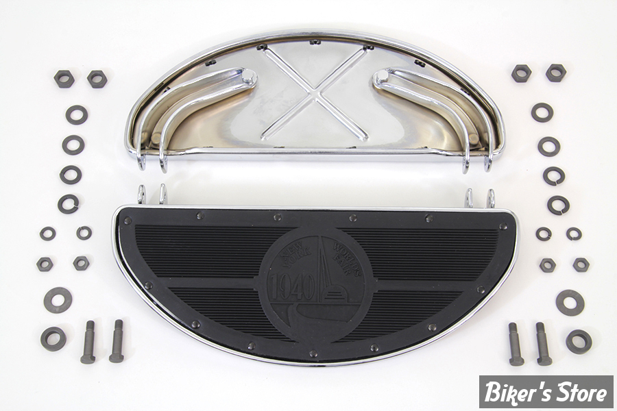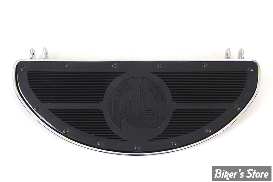 Replica chrome footboard set with rolled edge and a reinforced center includes commemeorative 1940 World's Fair rubber mats riveted on.