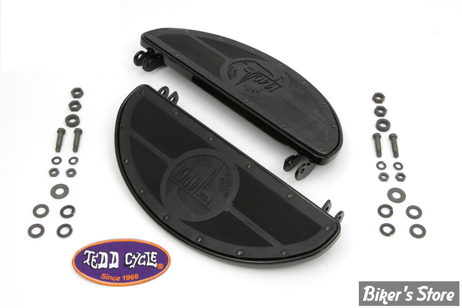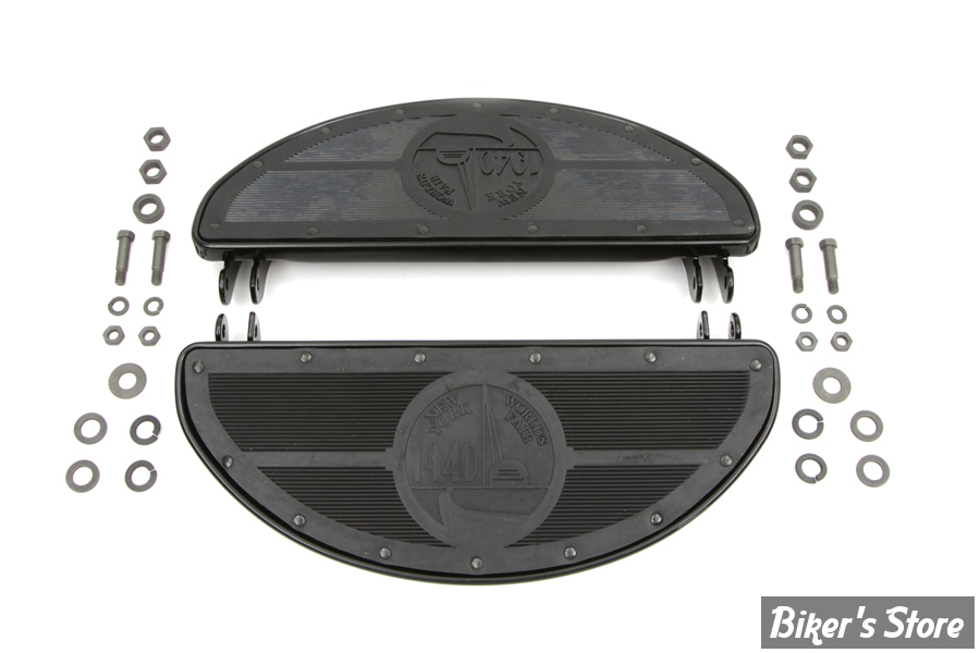 Replica black footboard set with rolled edge and a reinforced center includes commemorative 1940 World's Fair rubber mats riveted on.