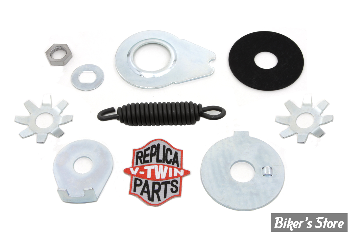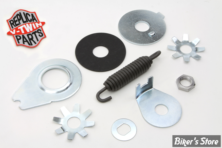 Le kit comprend 1 ressort d'embrayage intérieur et 1 ressort d'embrayage extérieur avec finition parkerisée. Toutes les autres pièces sont en zinc : 1 disque et support de friction, 1 rondelle de fibre, 1 disque d'embrayage, 2 rondelles d'araignée, 1 rondelle à languette, 1 écrou de pédale et 1 patch de bouclier Replica V-twin.