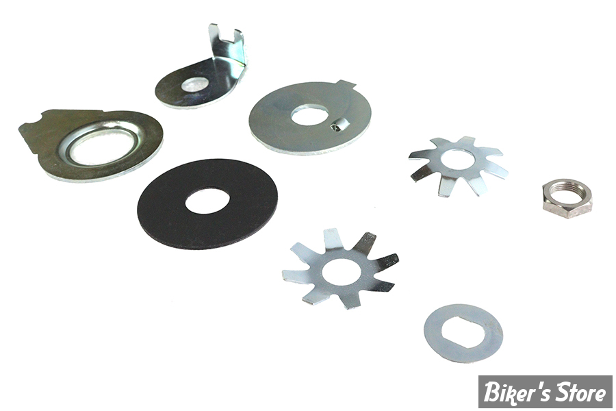 Kit includes friction disc, fiber washer, friction disc bracket, rocker clutch disc, spider washers, tab washer, and a rocker clutch pedal nut.