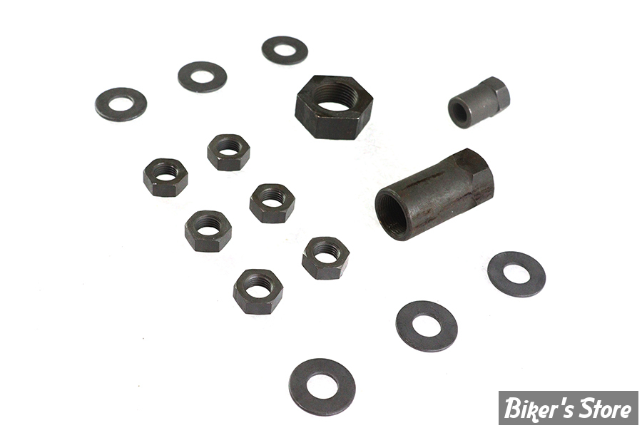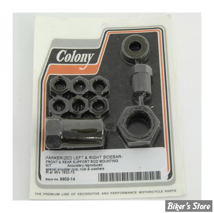 Black parkerized. Left & right side bar, front & rear support rod mount. Reproduction of the special shoulder nuts, nuts and washers used to mount the floorboards.