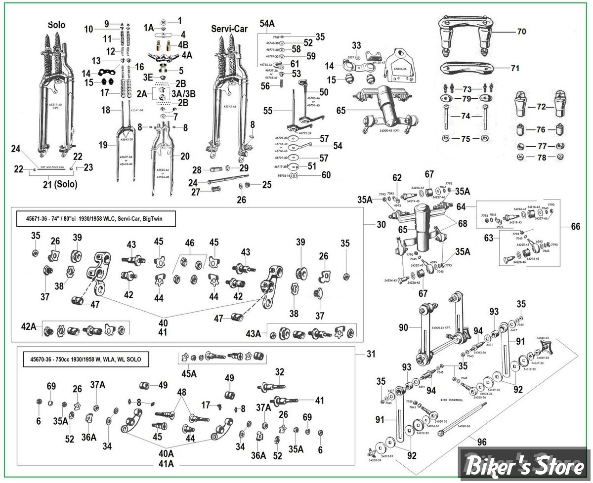 Eclaté des composants de fourche de la plupart des 45" solo de 1930 à 1952, Servicars de 1941 à 1957 et BigTwin de 1941 à 1948.