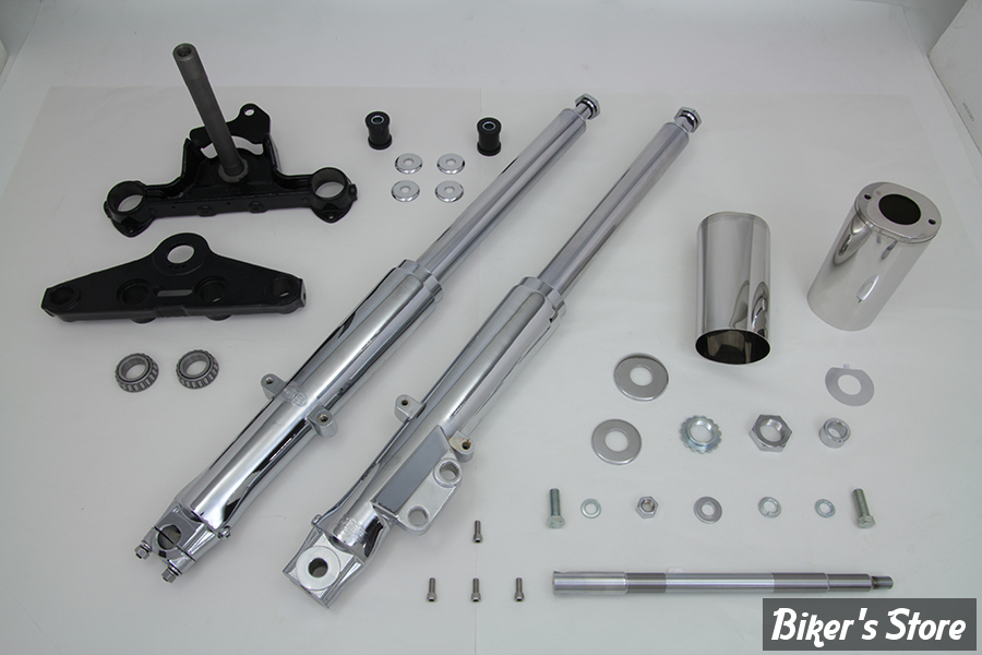 Complete FL fork assembly features fork slider cover screw set, black lower triple tree, cast top triple tree, fork installation kit, fork slider cover, fork slider assembly, and handlebar riser damper kit.