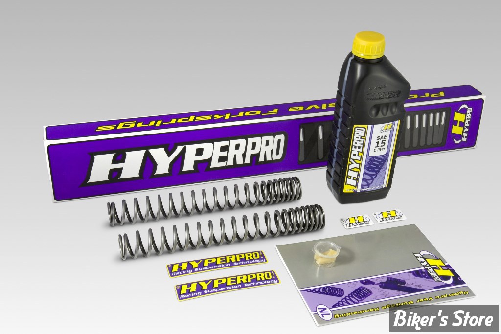 Hyperpro a passé des années de recherche sur le domaine dynamique de la technologie de ressorts de course et de Développements Spéciaux. Le soit-disant ressort progressif à une étape constitue une amélioration mais toujours est-il que ce n'est qu'un compromis entre le confort et la sécurité. Le départ soudain de mou au dur est souvent vu comme un désavantage et peut mener au désastre à de hautes vitesses. Hyperpro a trouvé une solution sans compromis: le "Design de Courbe Link System" (sytème de Liaison) pour ressorts. Avec cette construction, un ressort peut être conçu pour convenir aux exigences de la technologie moderne de la moto. Ceci, combiné avec l'utilisation des matériaux de la plus haute qualité vous aporte les meilleurs ressorts sur le marché. Les ressorts de la fourche sont fabriqués selon la norme DIN-2095, Classe 1 et sont spécialement polis pour un minimum de friction et ils portent une garantie à vie contre la casse. Les kits pour fourche sont livrés complets avec ressorts, un litre d'huile Hyperpro suspension, un petit tube Hyperpro de lubrifiant de joints spy et un manuel professionnel avec des conseils pour les suspensions.