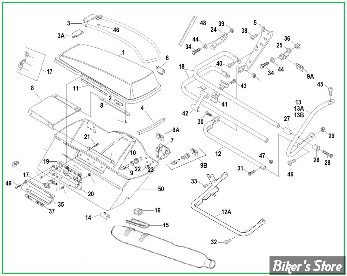 Eclaté des pièces de sacoches des Touring de 1993 à 2013.