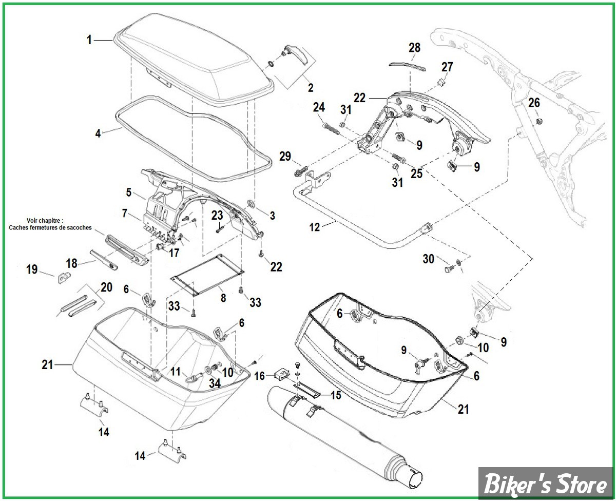 Eclaté des pièces de sacoches des Touring à partor de 2014.